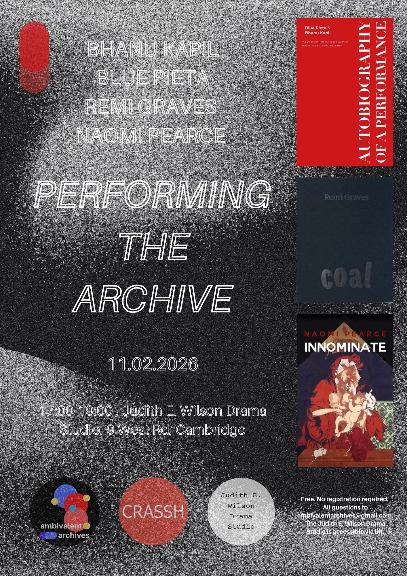 There will also be a dance performance by Blue Pieta, a response to Bhanu Kapil’s writing with and near the archive of Enoch Powell (Churchill College Archives Center). This collaborative work was previously performed at Maximillian William art gallery in London. Blue Pieta and Bhanu Kapil’s co-authored collection, Autobiography of a Performance, was published in 2025.