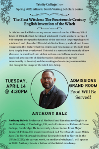 Professor Anthony Bale gives a guest lecture, ‘The First Witches: The 14th-century English invention of the witch’, on 14 April, at Trinity College, Connecticut, as part of the College’s A. K. Smith Visiting Scholar series.