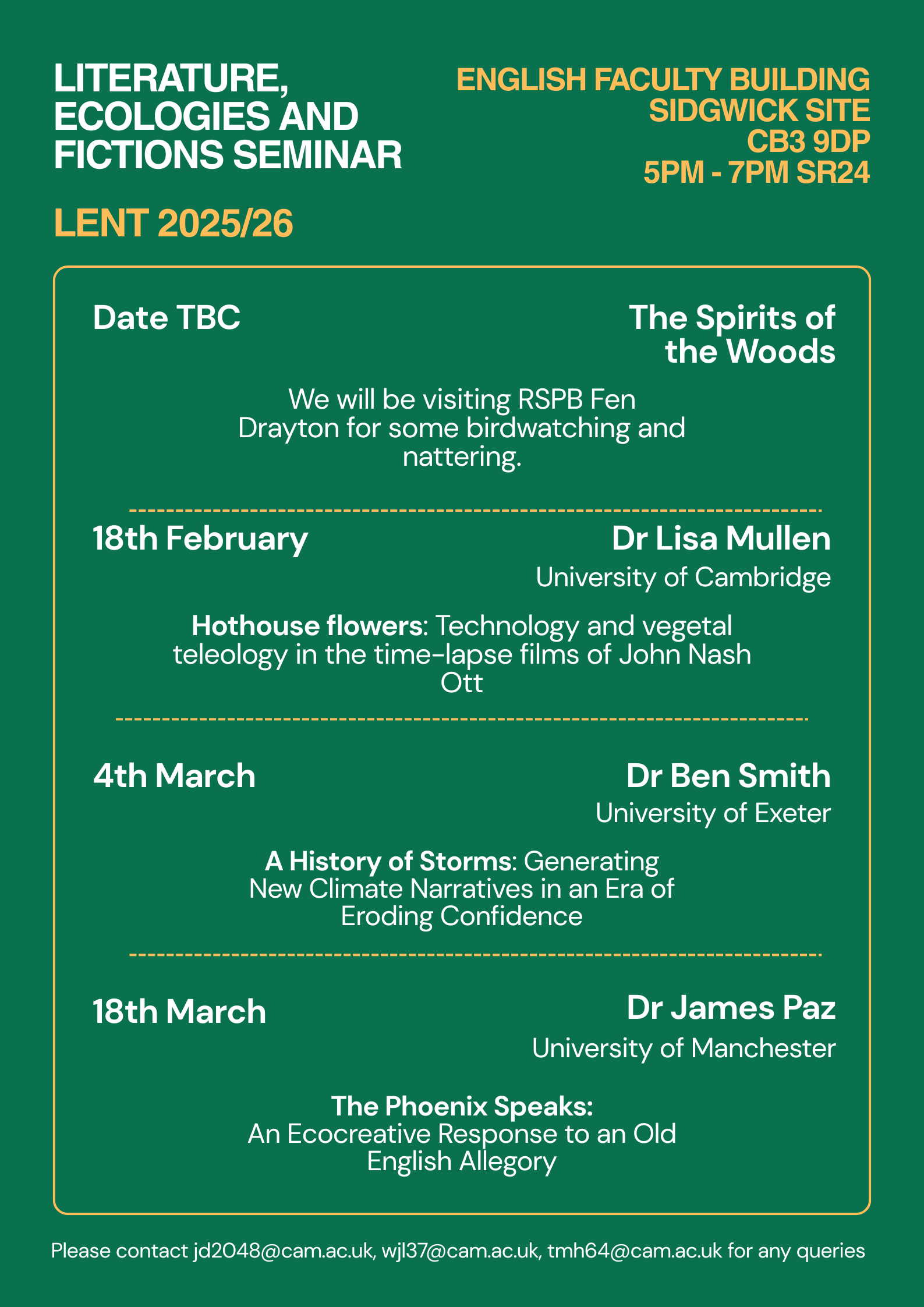 University of Cambridge members can sign up to our mailing list to receive news and reminders about upcoming seminars or adjacent events: https://lists.cam.ac.uk/sympa/info/english-literatures-ecologies-fictions